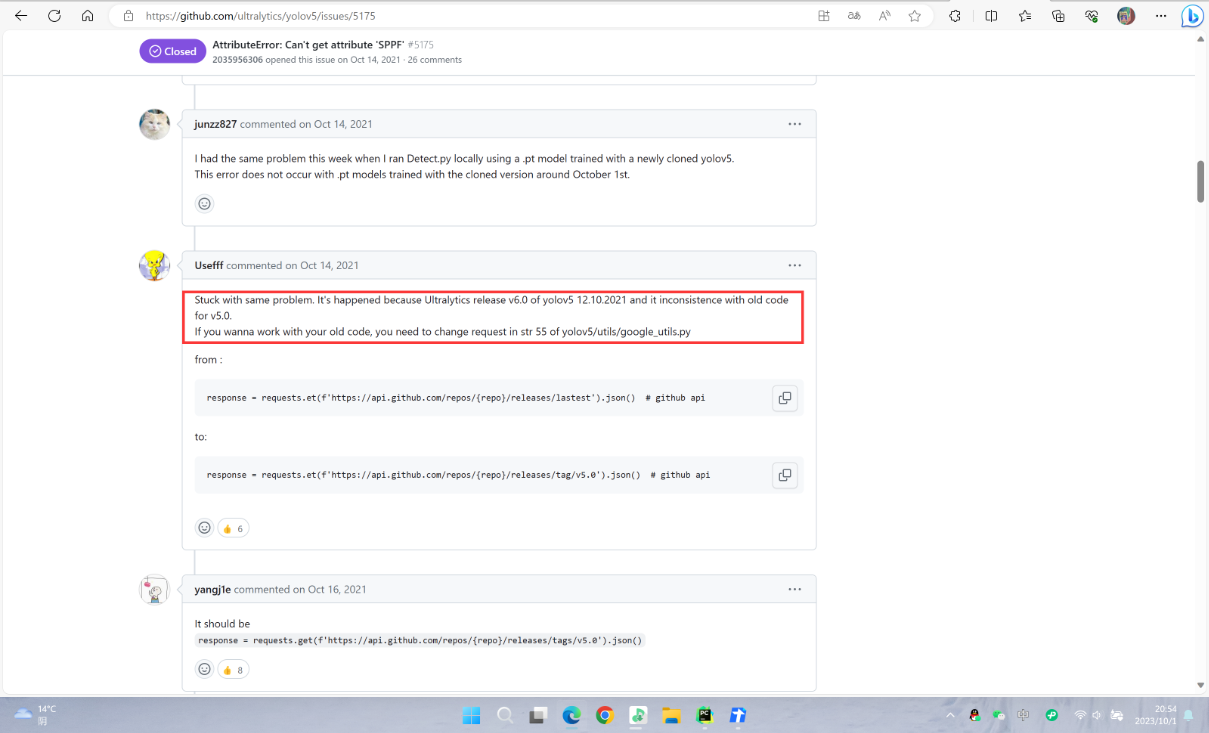 大致原因就是 Ultralytics 发布了yolo新版本,与v5不兼容,想要用v5的代码需要修改一个地方。