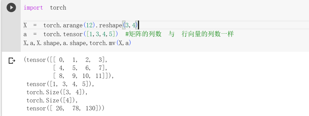 矩阵-向量积:一个矩阵(m * n)乘以一个列向量(n * 1),得到的结果是行向量(m * 1);一个矩阵(m * n)乘以一个行向量(1 * n),得到的结果是列向量(1 * m)。