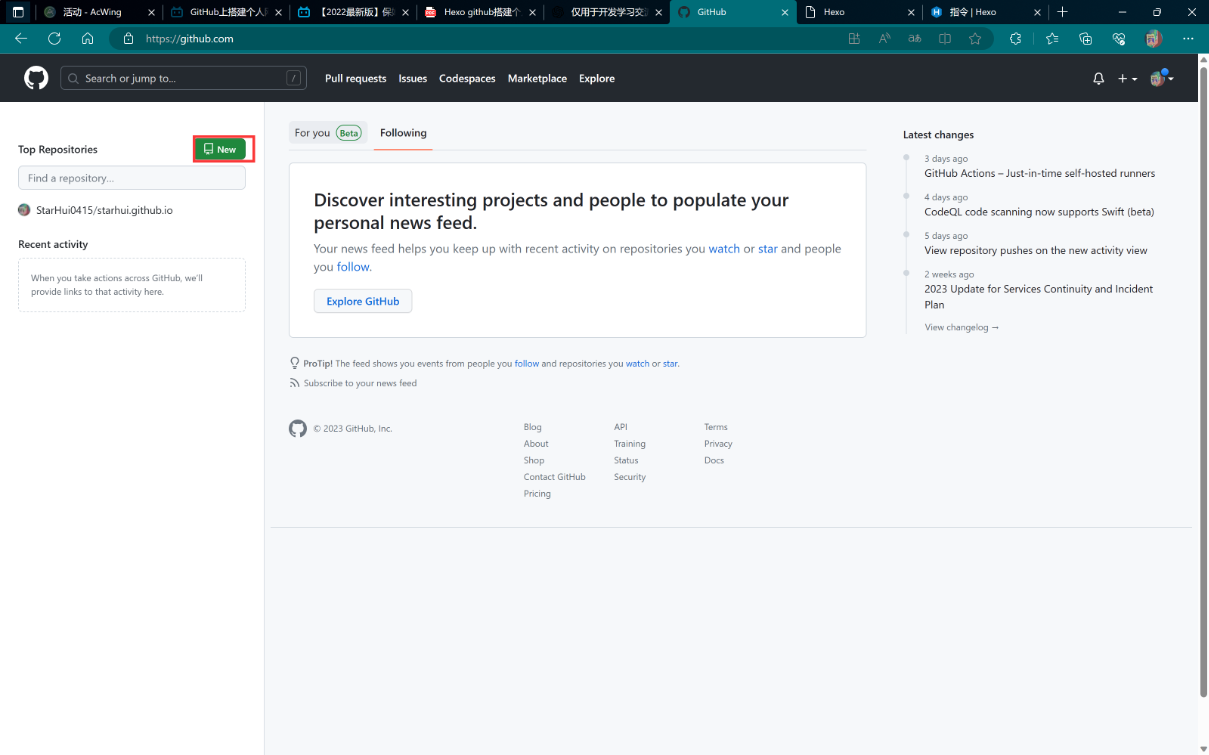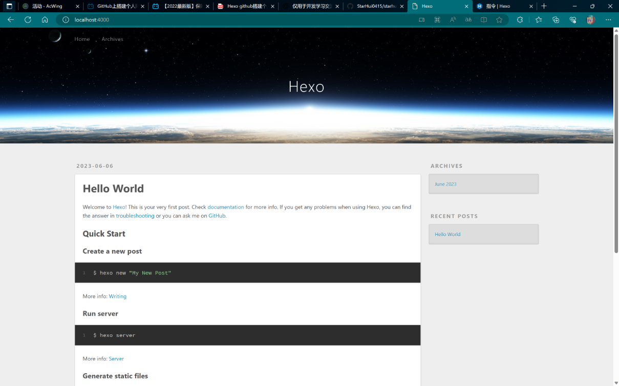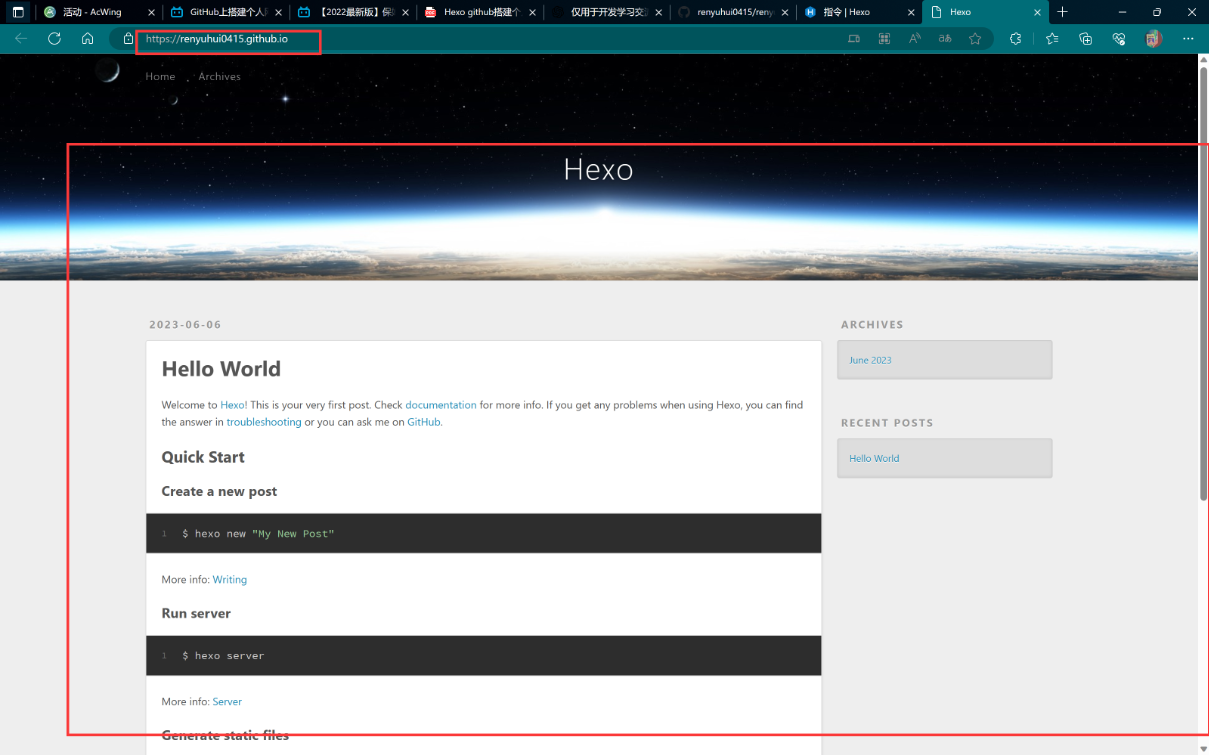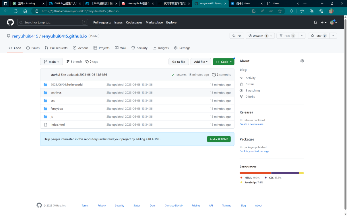 hexo d #部署网站此时GitHub仓库已经有刚才生成的静态文件了,而且博客网站已经可以访问了。
