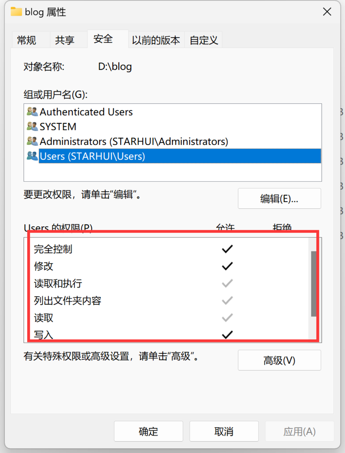 首先去D盘创建一个文件夹,把读写权限打开,否则后期会有权限问题出现。 新建文件夹blog,右键点击属性 -> 安全,把user权限打开