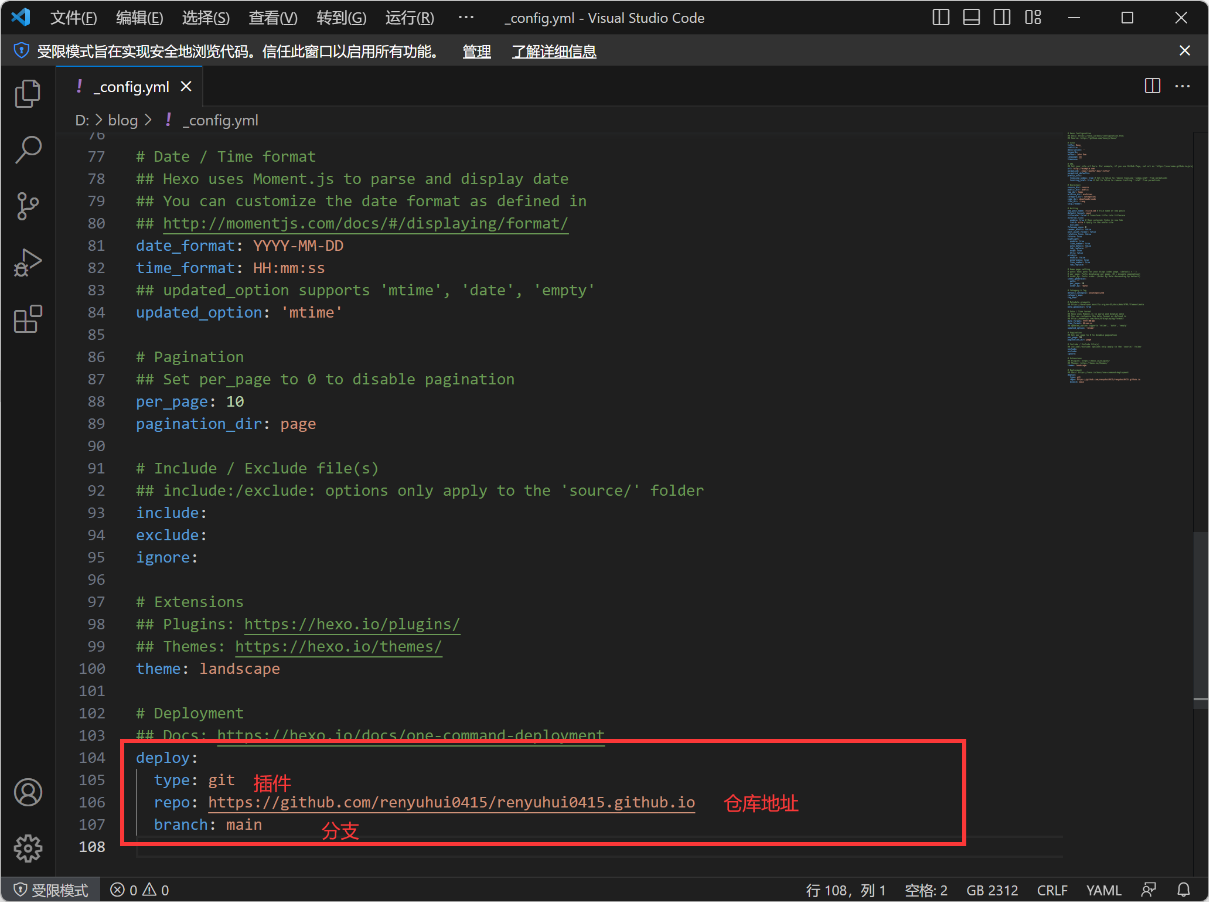 咱们选择的部署插件是git首先安装插件,并更改配置文件npm install hexo-deployer-git --save