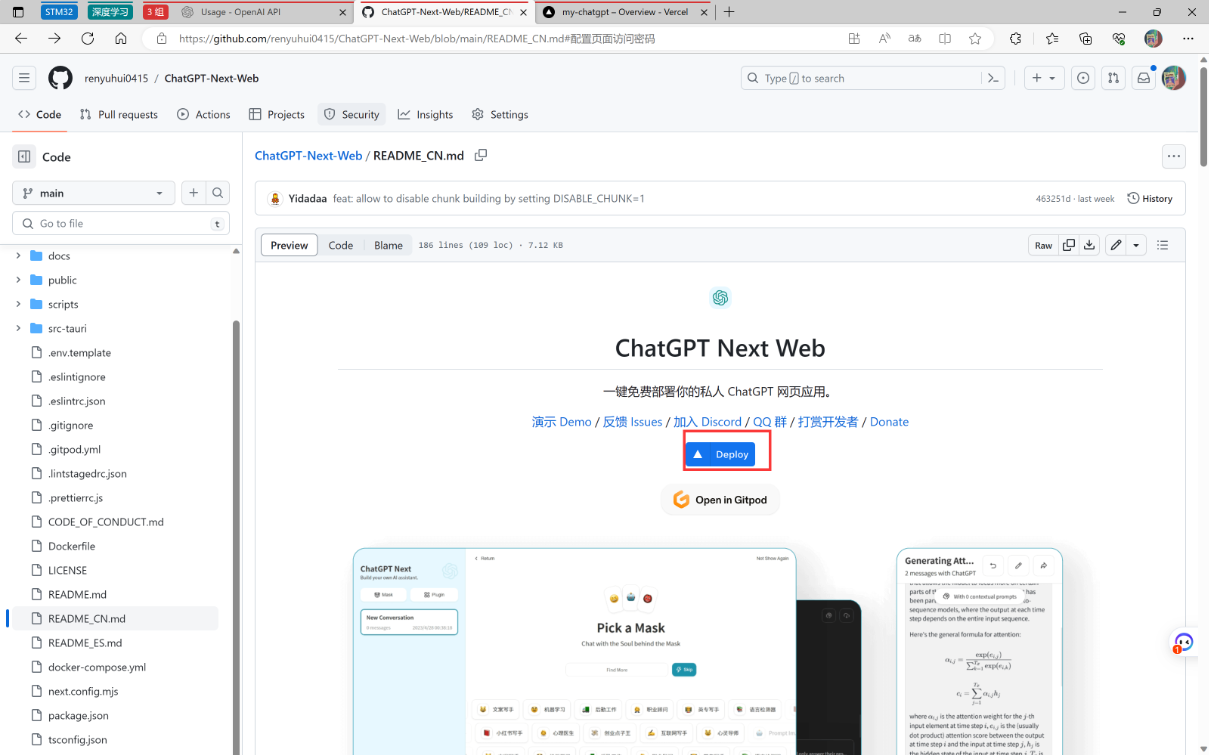 这个其实就是无脑搭建,在GitHub上找一个开源的ChatGPT项目,然后按照文档部署即可。 我搭建的就是这个开源项目 ChatGPT-Next-Web