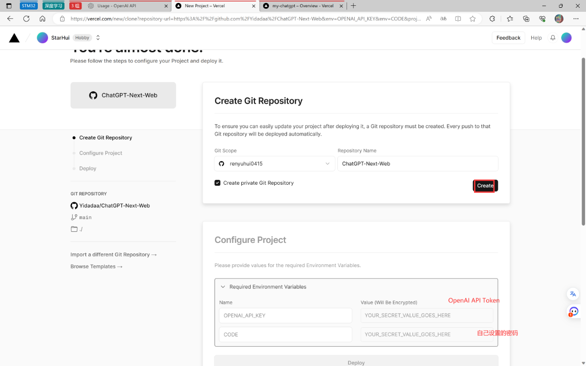 把复制的keys填到刚才的框内,点击Deploy部署即可,等待几分钟就部署好了。