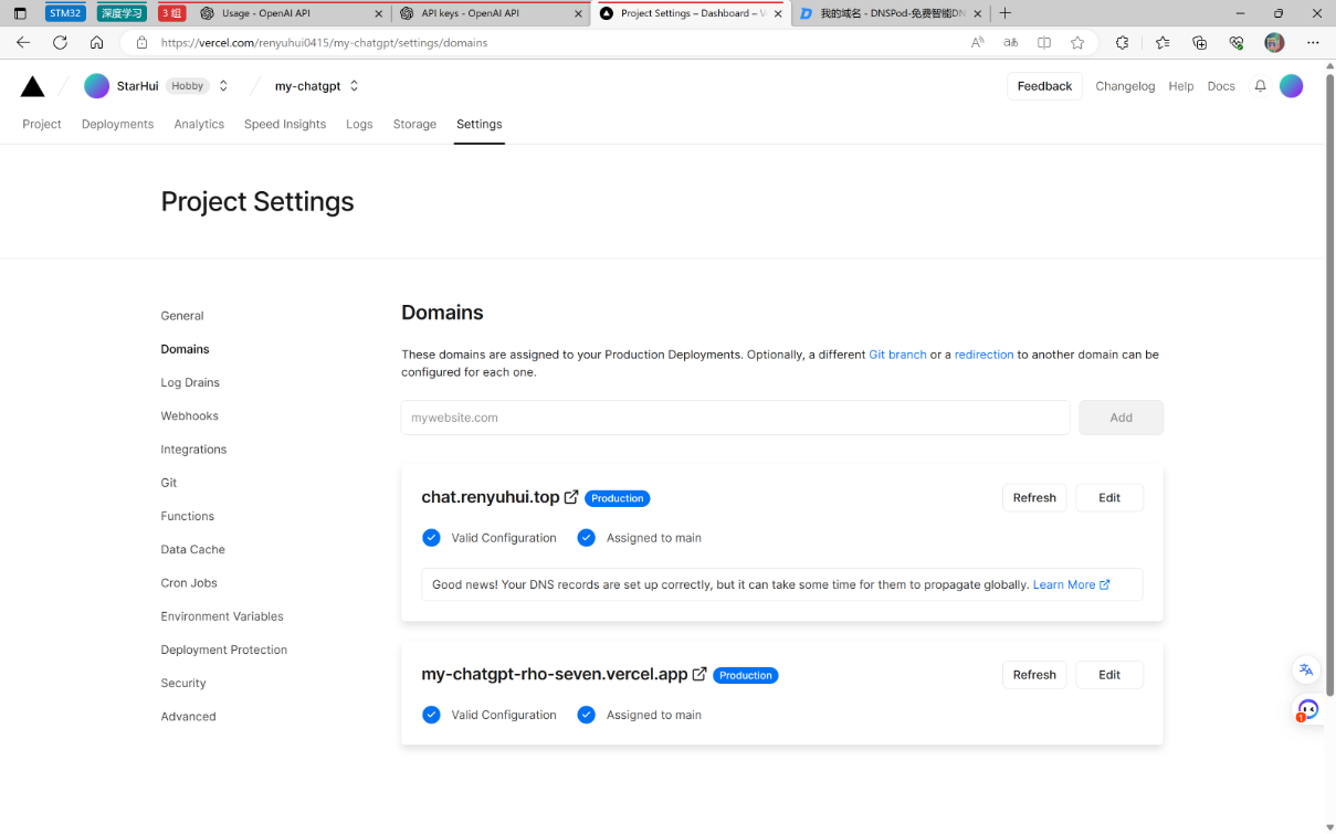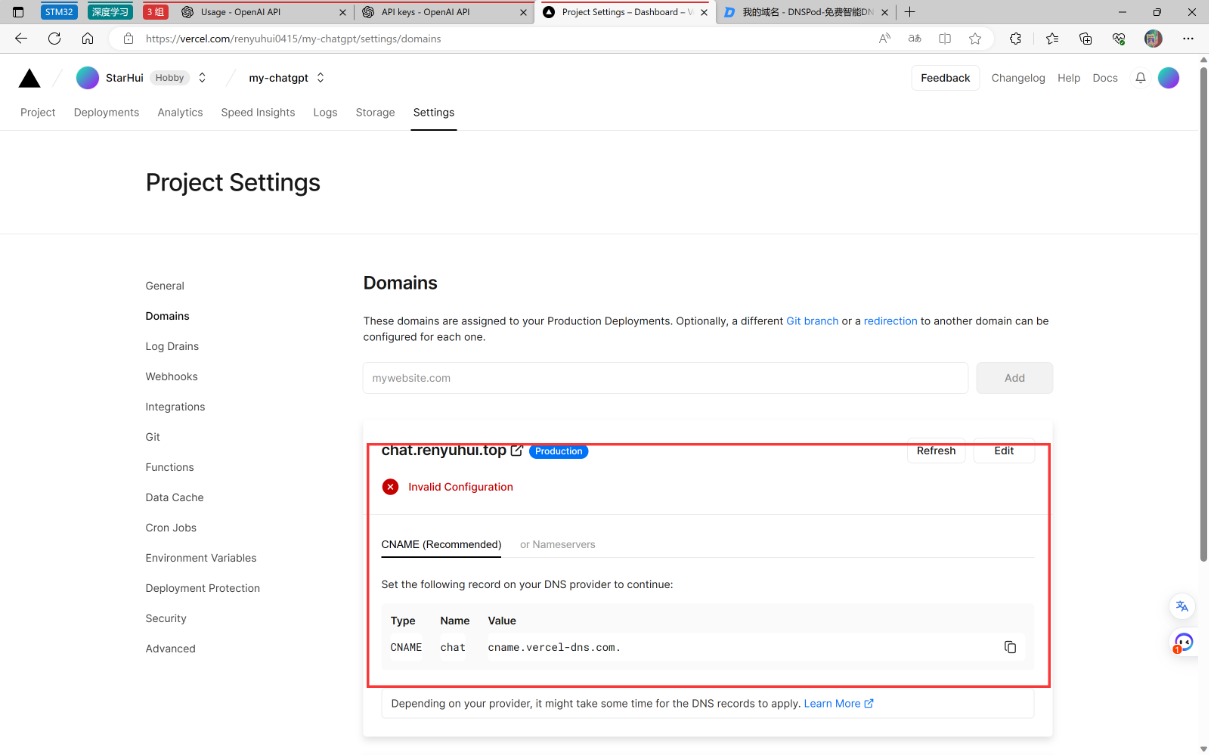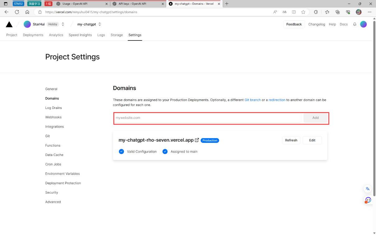 由于vercel的域名在国内会被墙,所以咱们绑定一下自己的域名。
