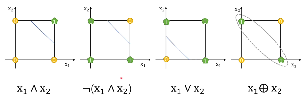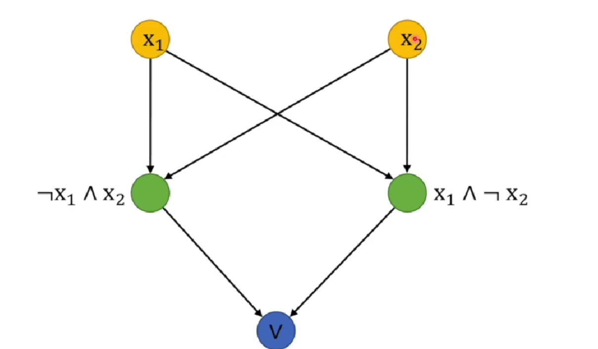 可以看到,前面三个可以通过一条直线分开0、1,最后的异或却无法分开,那么怎么办呢? 由于异或 是 与或非 组合的结果,那么我们可不可以通过多个感知机来实现呢?接下来让我们来看看。