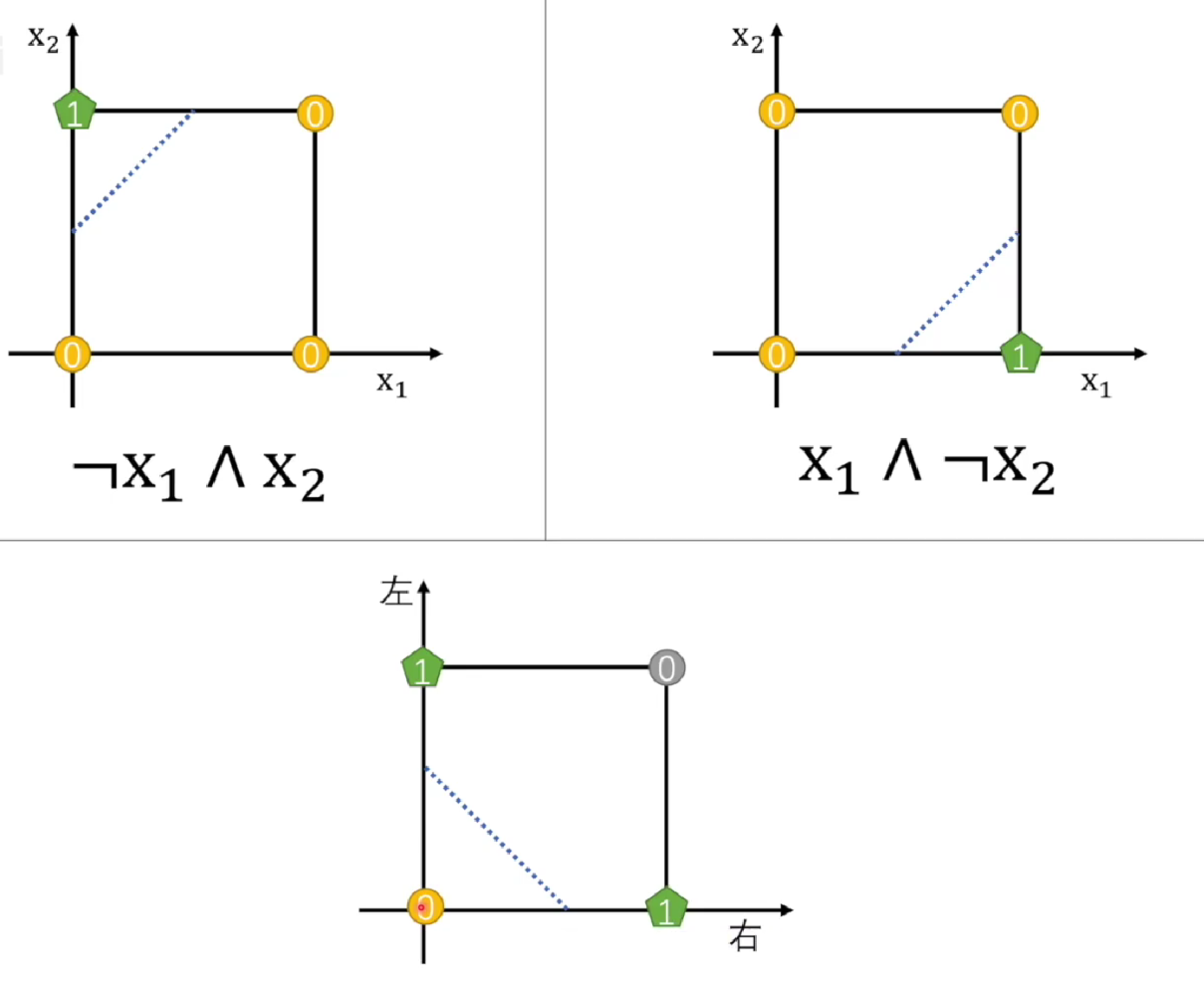 看样子是可行的,先分别用两个感知机把左右两边解决,最后再用一个感知机进行 或操作。