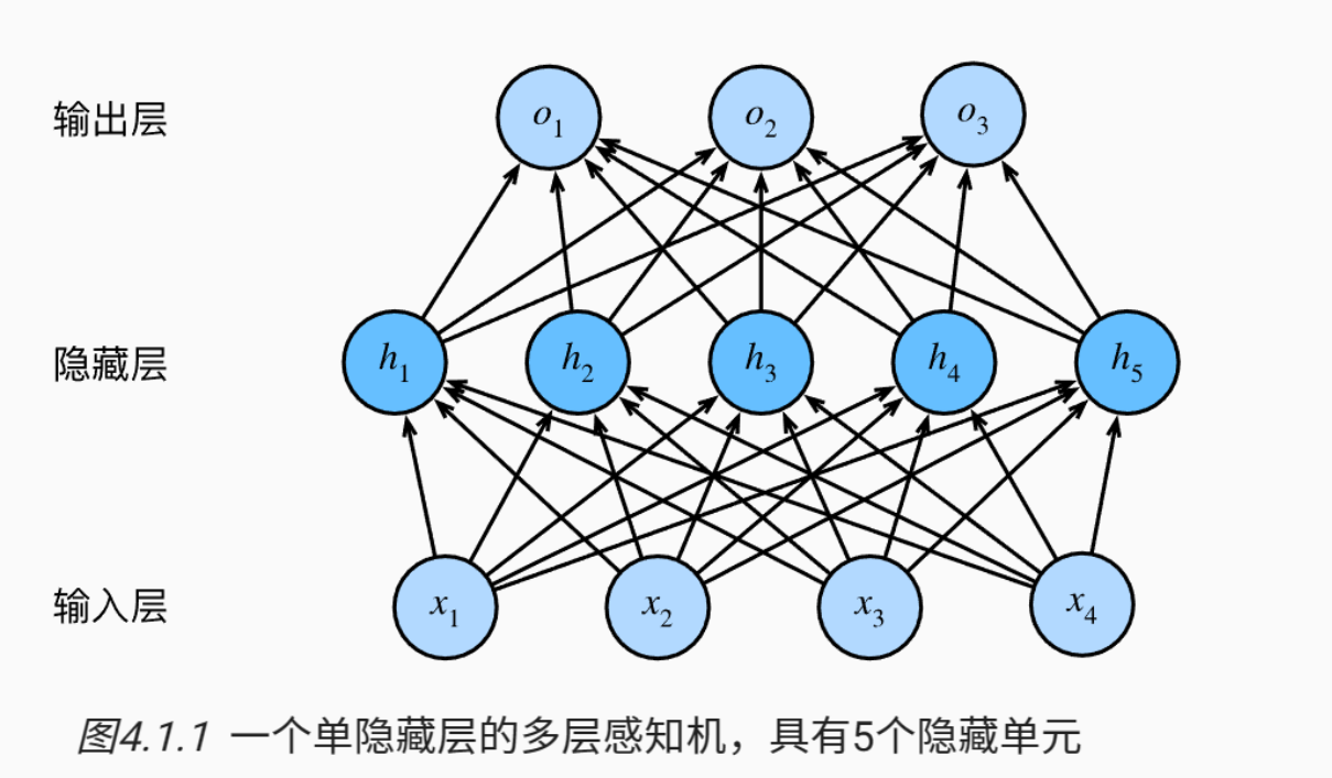 我们可以通过在网络中 加入一个或多个隐藏层 来克服线性模型的限制, 使其能处理更普遍的函数关系类型。 要做到这一点,最简单的方法是将许多全连接层堆叠在一起。 每一层都输出到上面的层,直到生成最后的输出。 我们可以把前