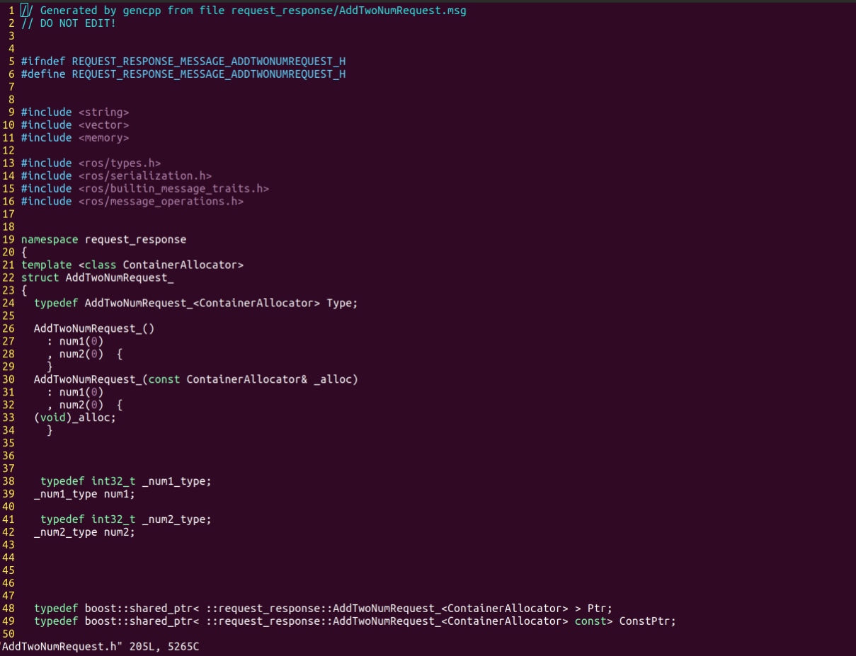 request_response::AddTwoNum为自己定义的srv生成的类,下面有request、response两个成员。而request有num1、num2两个成员变量,它们表示要发送的请求数据。